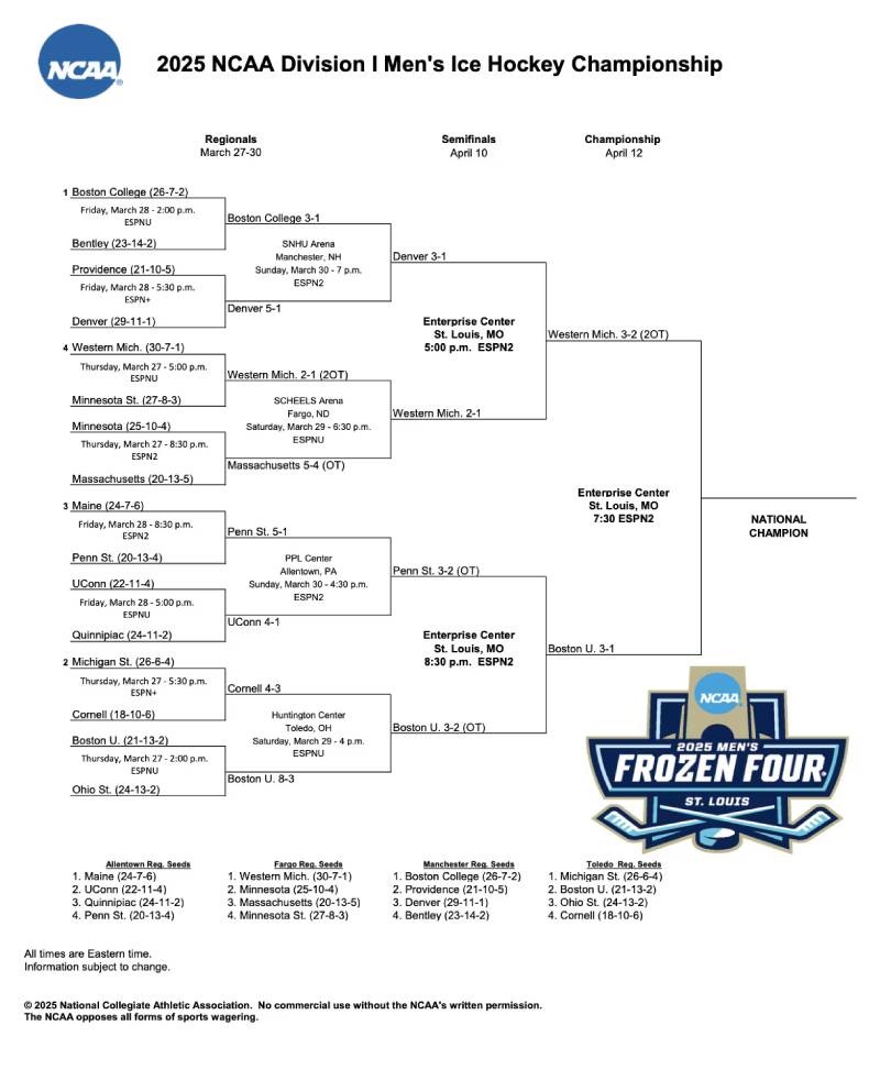 The complete 2025 NCAA Men’s Ice Hockey Championship bracket and full tournament schedule are available for fans looking to follow the results and key moments from this year’s competition.