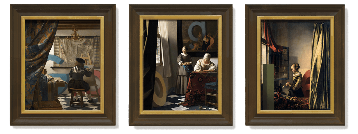 On the left, the Doodle artwork references “The Allegory of Painting” (1666-1668) and in the middle, “Woman Writing a Letter, with her Maid” (1670-1671).