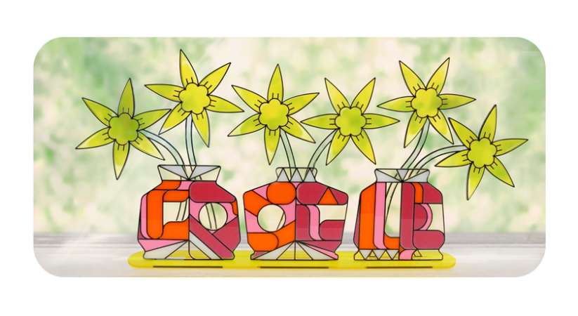 Items found in Wales served as inspiration for today’s vibrant Doodle. The daffodil, Wales’ national flower, is prominently featured in the hand-crafted artwork, which was created with cut acrylic glass in the style of traditional stained glass windows.