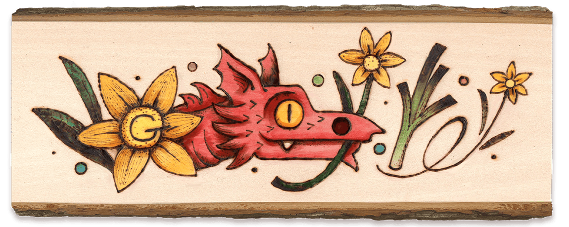 This handcrafted Doodle honors Dydd Gŵyl Dewi Sant, or St. David’s Day in Wales! The tale of Dinas Emrys, according to which two dragons were engaged in combat in a lair below the king’s castle, caused the castle to collapse multiple times, serves as the basis for the artwork. The red dragon eventually won and came to represent Welsh pride. The flag is flying over the country these days.