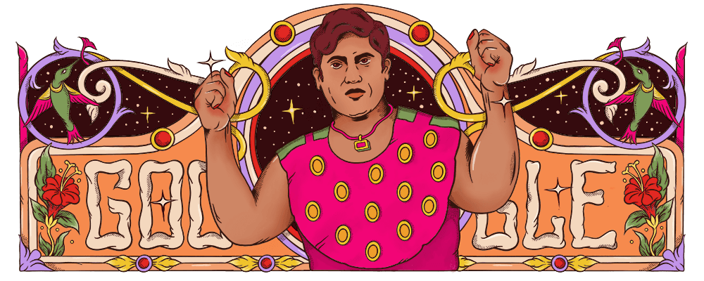 Hamida Banu, an Indian wrestler who is regarded as the country’s first professional female wrestler, is honored in this Doodle. Today’s Doodle is an illustration by guest artist Divya Negi, who is located in Bangalore, and shows Hamida surrounded by local flora and fauna.