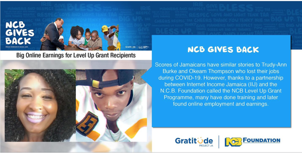 However, approximately 1,400 Jamaicans, including Trudy-Ann and Okeam have been given renewed hope of taking care of their families, thanks to a partnership between Internet Income Jamaica (IIJ) and the N.C.B. Foundation to provide training for online employment to Jamaicans who have lost their jobs due to COVID-19.