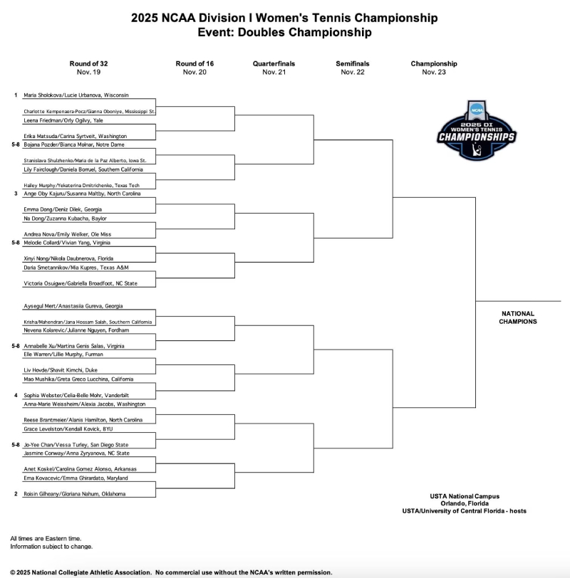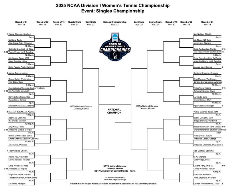 2025 NCAA DI women’s singles and doubles tennis championship schedule