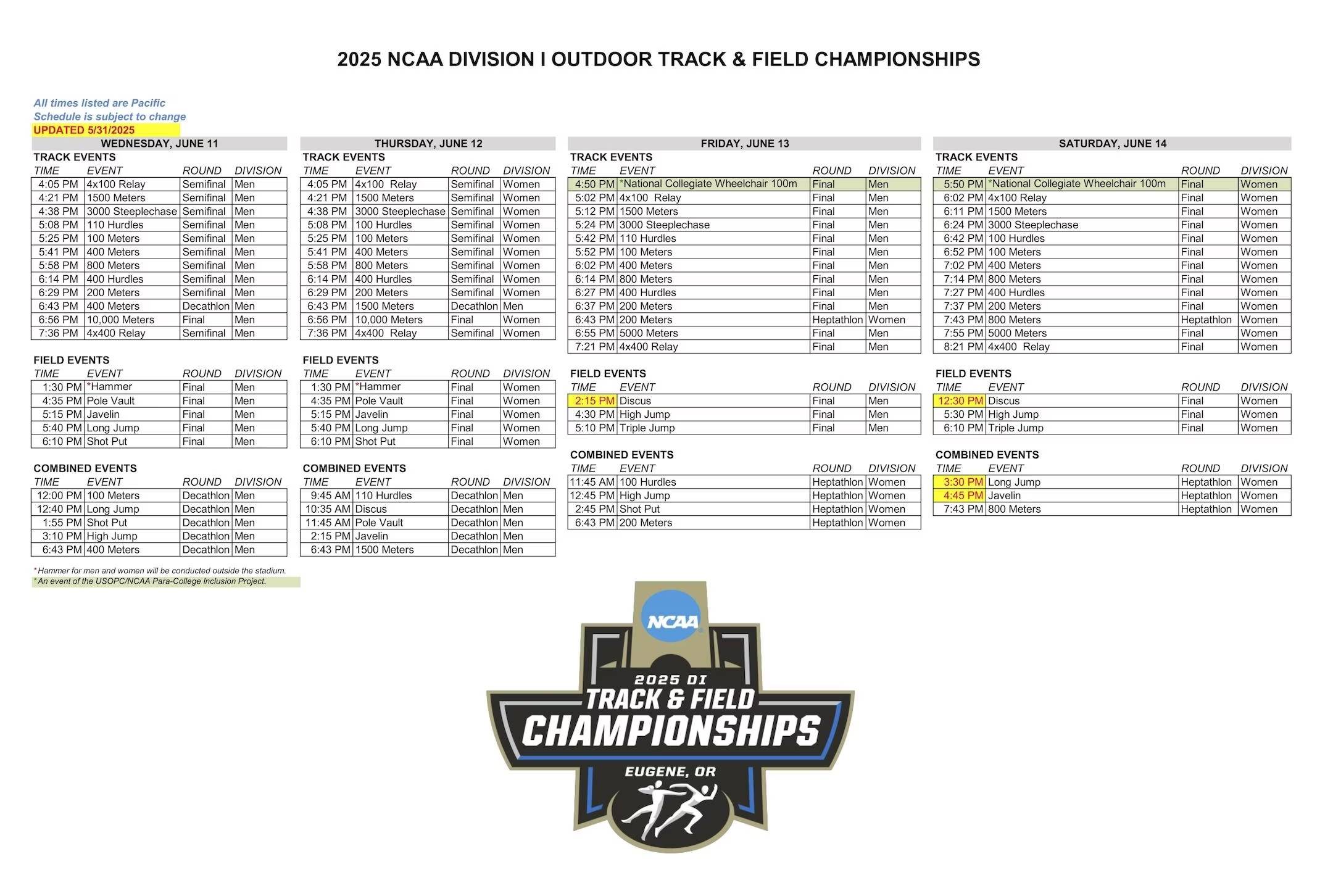 | Men’s Day 1 | Wednesday, June 11 | 7:00 PM | Hayward Field | ESPN |