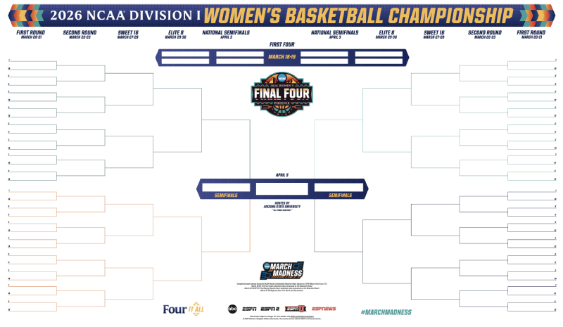 This is the official, printable bracket for the 2026 NCAA Division I women’s basketball tournament. The event will include 68 teams, with the final four at-large teams, seeded 65 through 68, competing in the First Four prior to the commencement of the first and second rounds. The top 16 seeds will host the tournament’s first and second rounds, as well as the First Four. The Sweet 16 and Elite Eight will be held in Fort Worth, Texas and Sacramento, California, respectively, with the Final Four and National Championship Game taking place in Phoenix at the Mortgage Matchup Center.