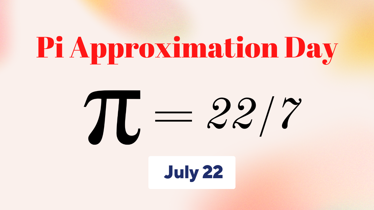 Pi Approximation Day is celebrated globally on July 22 each year. There is a special reason why this day is observed on July 22. The fraction 22/7 is an approximation of Pi. Since the fraction 22/7 represents the number pi, this day is observed annually on July 22. Here, the numerator 22 represents the date (the 22nd day of the month) and the numerator 7 represents the month in the fraction 22/7, which denotes Pi (July).