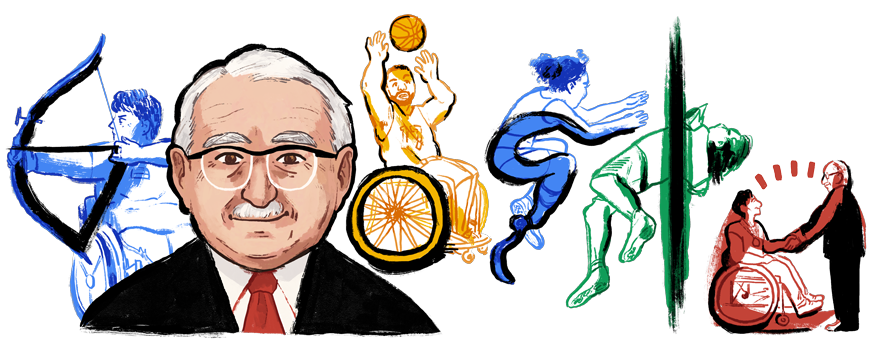 The present Doodle, represented by Baltimore-based guest artist Ashanti Fortson, praises the 122nd birthday of Jewish, German-born British neurologist Professor Sir Ludwig “Poppa” Guttmann, organizer of the Paralympic movement.