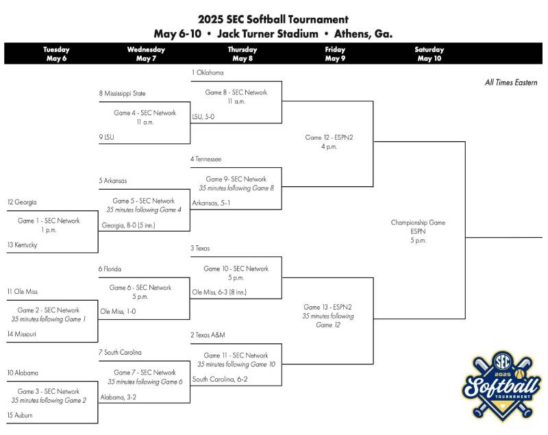 The 2025 SEC Softball Tournament is underway at Jack Turner Stadium in Athens, Georgia, running from May 6 to May 10. This single-elimination tournament features 15 teams, with the champion earning an automatic bid to the 2025 NCAA Tournament.