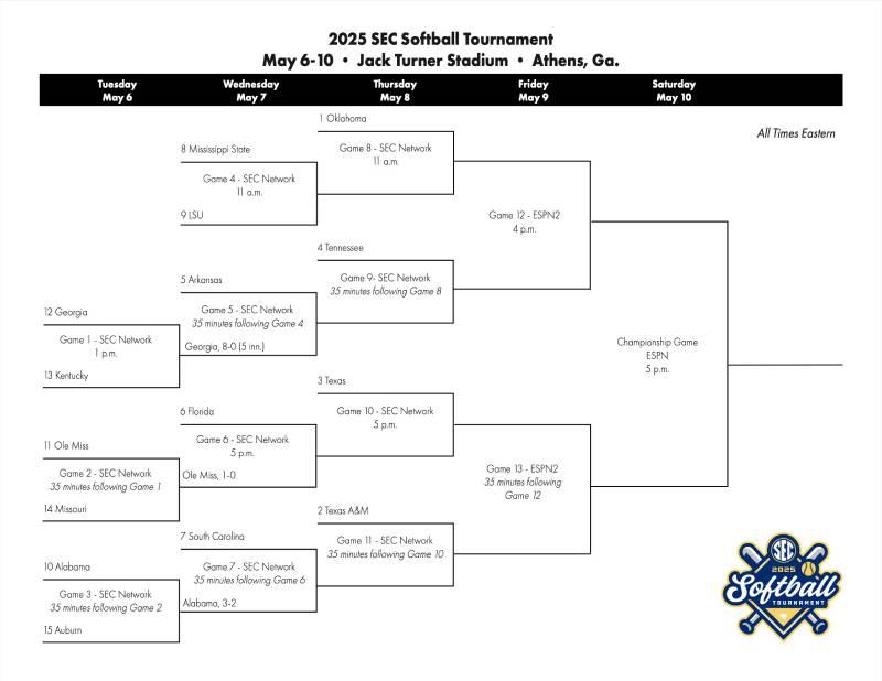 The 2025 Southeastern Conference (SEC) Softball Tournament is underway at Jack Turner Stadium in Athens, Georgia, running from May 6 to May 10. This year’s tournament features a 15-team single-elimination format, marking the debut of Oklahoma and Texas in SEC postseason play.