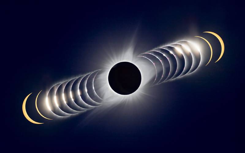 A solar eclipse is essentially a cosmic confluence that occurs when the Sun, Moon, and Earth align. The moon passes in front of the sun and temporarily blocks the sun’s light.