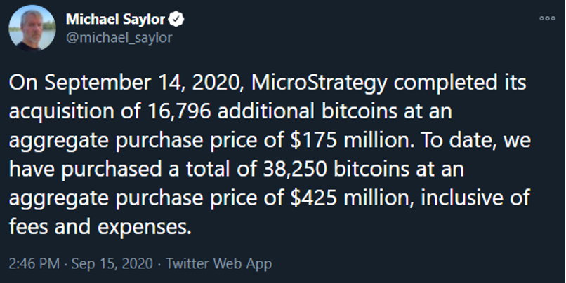Michael Saylor, CEO of Nasdaq-listed MicroStrategy, shocked the world of Crypto Twitter in September by announcing that his company acquired an additional 16,769 Bitcoin for a total price of $175 million. Thus, MicroStrategy owned 38,250 Bitcoin in total at an aggregate purchase price of $425 million.
